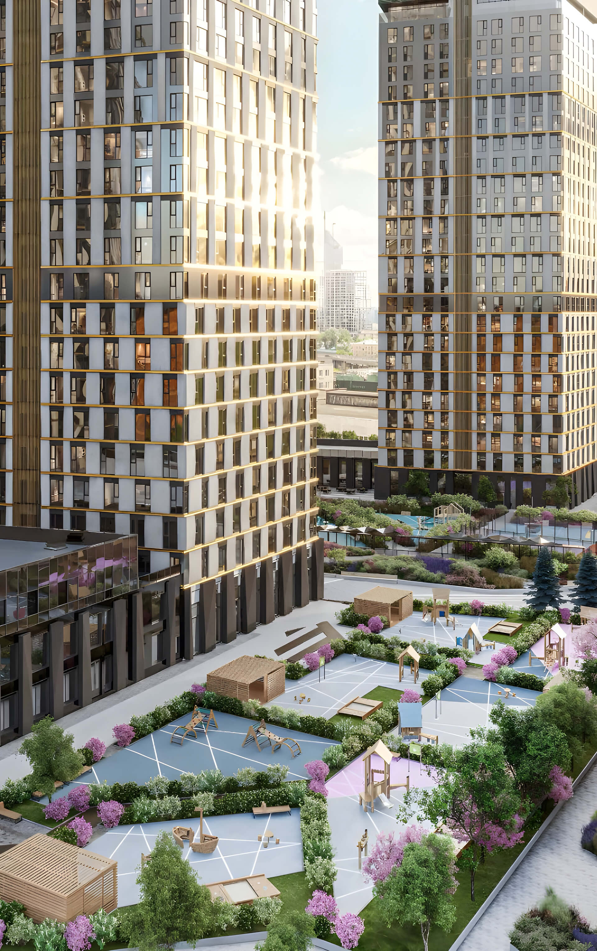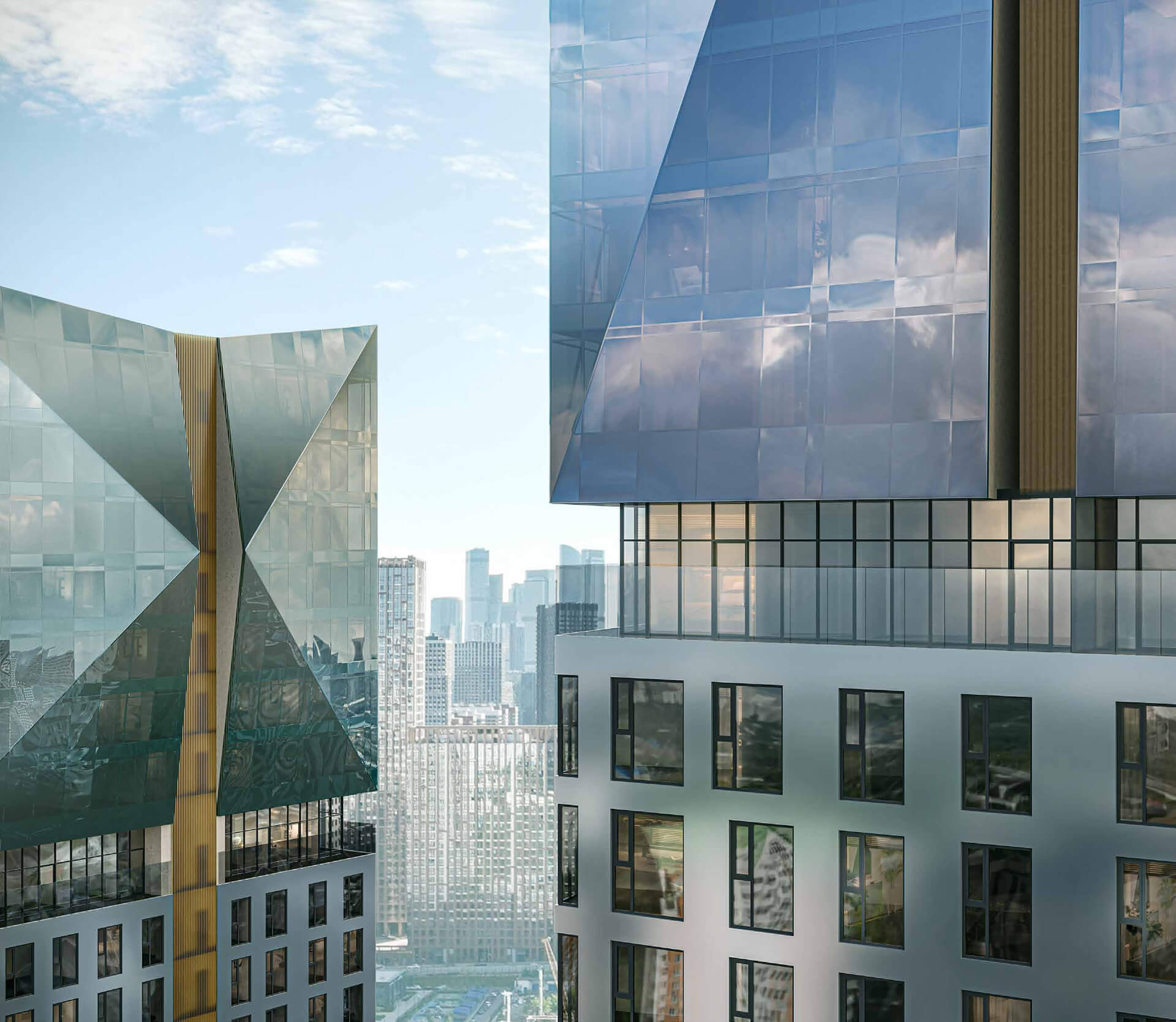 Важной особенностью проектного решения стал эффект «навершия» — оригинальная конструкция верхней части корпусов, создающая узнаваемые «кристаллы». Они формируют инновационный силуэт и подчёркивают премиальный характер комплекса. Дополнением выступают декоративные элементы: цветное верхнее остекление, горизонтальные металлические пояса и ламели с отделкой под латунь. Эти детали создают эстетическую глубину и визуальную завершённость архитектурного образа. Внимание к композиции и контрасту делает фасады не просто элементом здания, а художественным объектом.