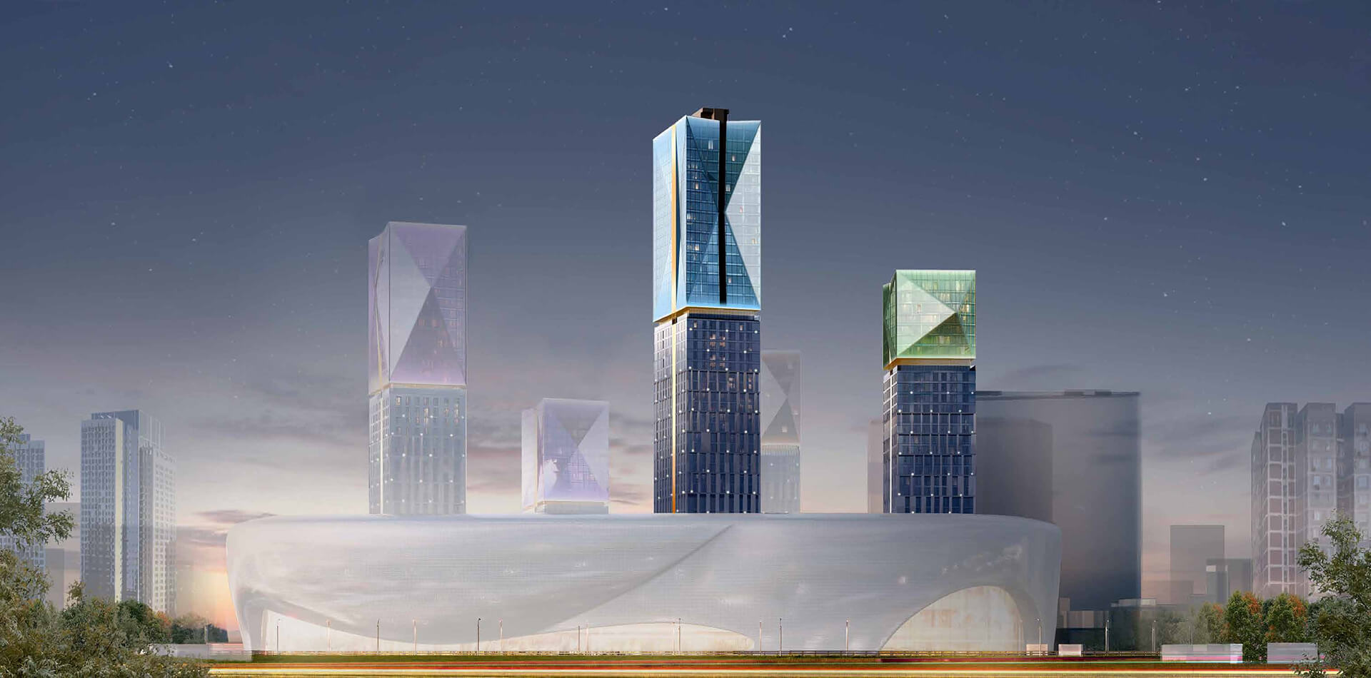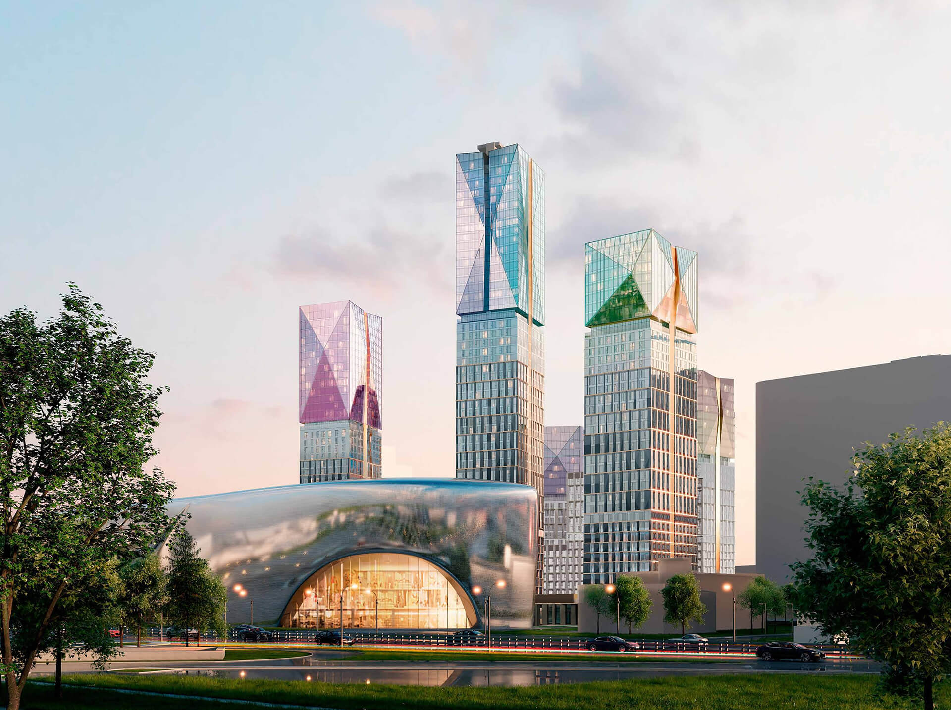 Отдельного внимания заслуживает архитектурная подсветка. Она формирует три сценария — повседневный, праздничный и дежурный — каждый из которых раскрывает уникальные качества поверхности фасадов. Световые алгоритмы позволяют создавать эффект мерцания или полноценного сияния, подчёркивая геометрию зданий и создавая атмосферу современного мегаполиса. Эта подсветка не только украшает комплекс, но и делает его ориентиром в городской среде в вечернее время. Архитектура «Сезар Силика» — это проявление философии emo-tech, объединяющей рациональные решения и эмоциональное воздействие на человека.