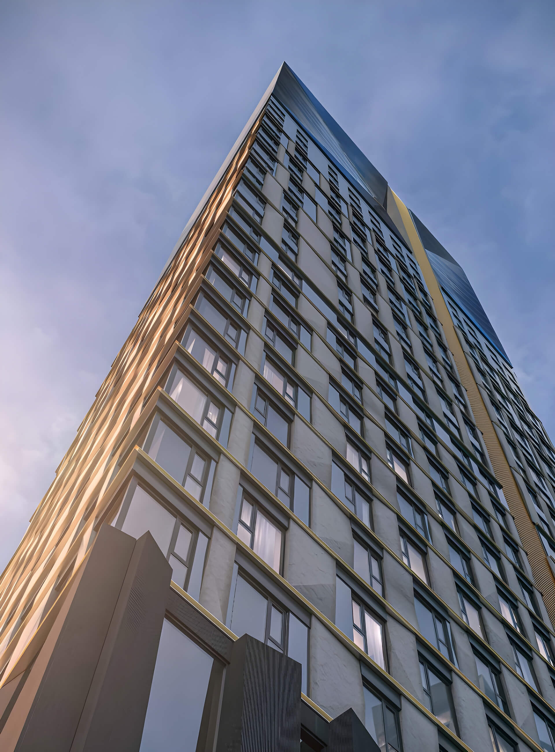 Важной особенностью проектного решения стал эффект «навершия» — оригинальная конструкция верхней части корпусов, создающая узнаваемые «кристаллы». Они формируют инновационный силуэт и подчёркивают премиальный характер комплекса. Дополнением выступают декоративные элементы: цветное верхнее остекление, горизонтальные металлические пояса и ламели с отделкой под латунь. Эти детали создают эстетическую глубину и визуальную завершённость архитектурного образа. Внимание к композиции и контрасту делает фасады не просто элементом здания, а художественным объектом.